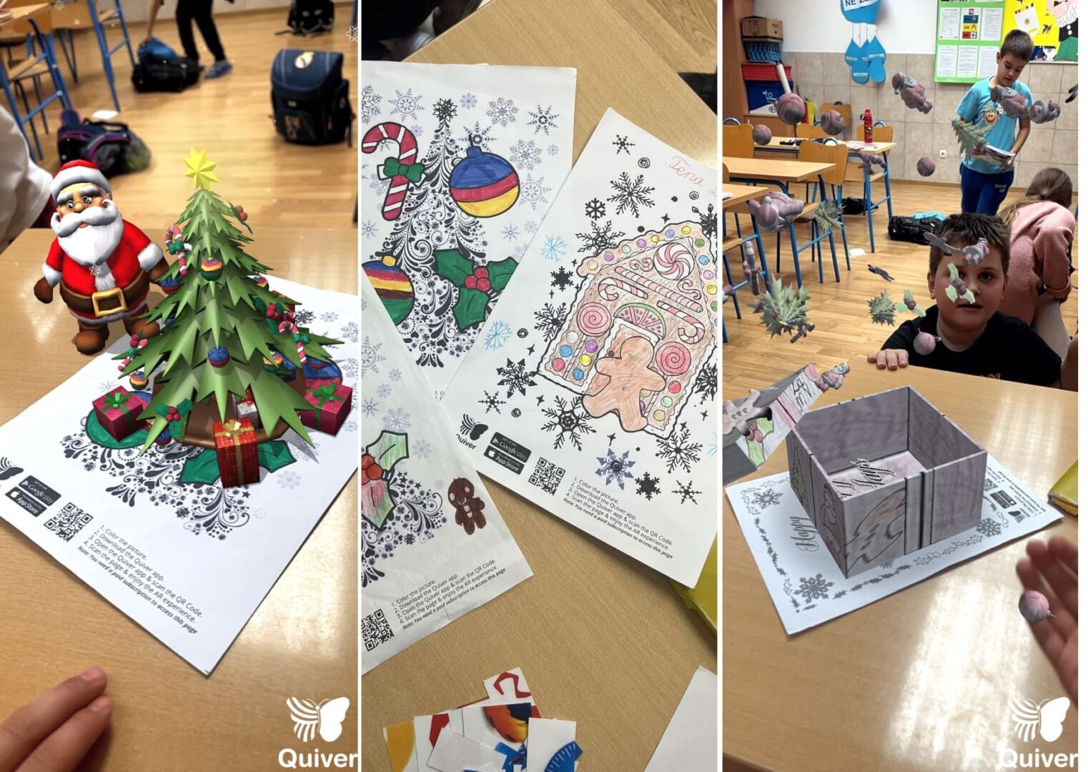 Prije odlaska na zimske praznike, učenici 2. i 3. razreda, imali su priliku upoznati čarobne bojanke iz programa Quiver. Zadatak im je bio obojati bojanku koristeći boje po vlastitom odabiru. Kada su završili s bojanjem, korištenjem pametnog telefona, njihove bojanke smo oživjeli. Tako je bojanka s poklonom postala virtualni 3D poklon koji je otkrivao božićne ukrase i prigodnu poruku, dok je bojanka s božićnim drvcem oživjela božićno drvce do kojeg se došetao Djed Mraz. Virtualne prikaze mogli smo vidjeti samo ukoliko smo gledali kroz ekran pametnog telefona. Kako je izgledao ovaj zadatak, možete pogledati u fotogaleriji.