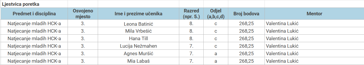 U subotu, 14. 3. 2026., održano je 27. natjecanje mladih Hrvatskog Crvenog križa. Na natjecanju su sudjelovale učenice 8. c razreda: Leona Batinić, Mila Vrbešić i Hana Till, učenice 7. a razreda: Agnes Muršić i Mia Labaš te Lucija Nežmahen, učenica 7. c razreda.