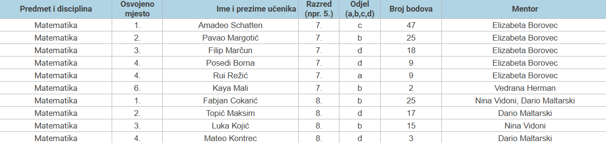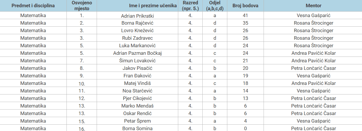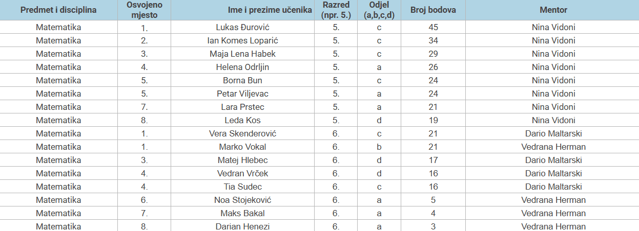 Nakon revizije Županijskog stručnog povjerenstva objavljujemo konačne rezultate školskog Natjecanja iz matematike. Školsko Natjecanje iz matematike održano je 26. 1. 2026. na VI. osnovnoj školi Varaždin s početkom u 10 sati. Natjecanje je uspješno provedeno u skladu s uputama AZOO-a. Na natjecanju je sudjelovalo 42 učenika naše škole. Na županijsko Natjecanje pozivaju se učenici: