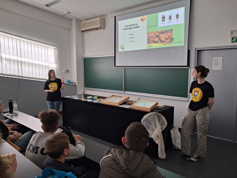 Nakon prelaska u zgradu matematike, učenici su prisustvovali predavanju iz biologije “Od pčele do košnice do ekosustava”. Kroz ovu temu naglašena je važnost povezanosti živih bića i okoliša, ali i matematičkih obrazaca koji se pojavljuju u prirodi, poput strukture saća.