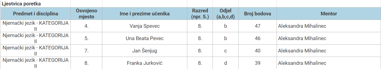 Županijska razina Natjecanja iz njemačkog jezika održana je 23. veljače 2026. godine u VII. osnovnoj školi Varaždin. Našu školu predstavljala su četiri učenika u kategoriji II (njemački jezik kao izborni strani jezik). Učenici su ostvarili dobre rezultate i uspješno predstavili našu školu.